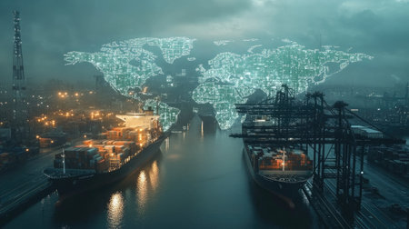 Cargo ships docked at a harbor, overlaid with a digital world map, symbolizing global trade and logistics.