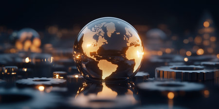 An illuminated world map dominates the image, showcasing interconnected lines arching across the globe. The scene depicts a network with glowing lights representing cities and infrastructure. Warm tones blend with cooler hues, suggesting a dusk setting. Suitable for illustrating concepts related to globalization, technology, and energy distribution.