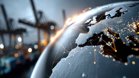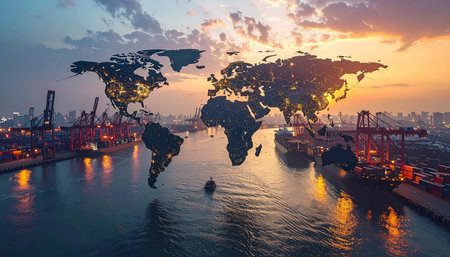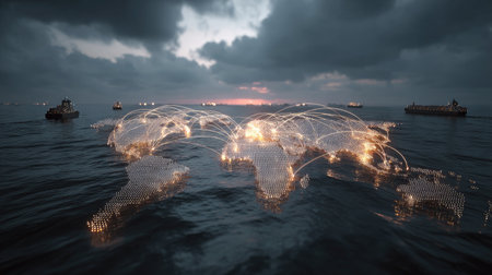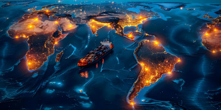 This striking image illustrates a detailed world map showcasing shipping routes illuminated by city lights. Cargo ships navigate the oceans, representing global trade and connectivity.