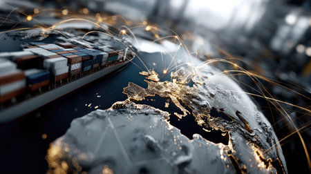 This stunning visual captures a container ship navigating the global trade network, highlighting connections over Europe at night, showcasing economic activity.