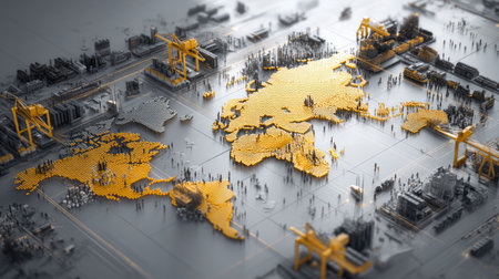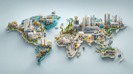 This creative visual features a world map built from blocks, symbolizing the interconnected nature of global trade and industry. It illustrates transportation, logistics, and economic growth, showcasing a vibrant representation of regions and their industrial significance.