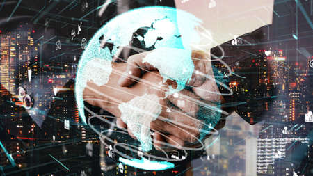 Futuristic global social media, people network and tacit digital data sharing . Concept of smart digital transformation and technology disruption that changes global trends in new information era .