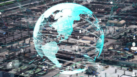 Shipping harbor aerial view with graphic of network technology modernization showing concept of smart digital autonomous technology to control goods import and export stocks calculations .