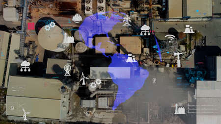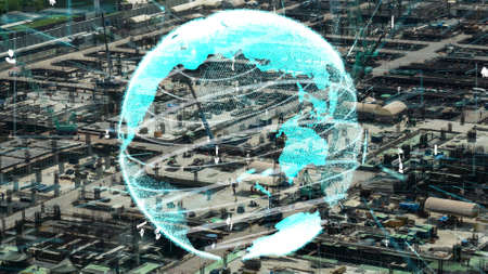 Future factory plant and inventive energy industry concept in creative graphic design. Oil, gas and petrochemical refinery factory with hologram showing next generation of power and energy business.