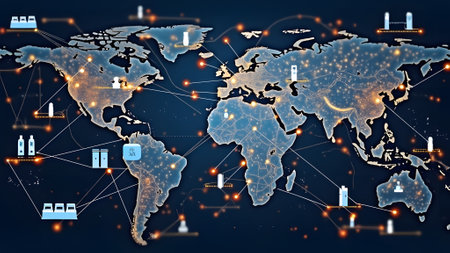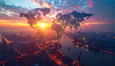 A stylized map shows illuminated connections across continents, highlighting global trade and communication networks in a modern, tech-inspired design.