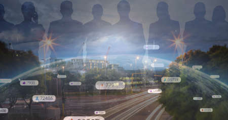 Image of social media icons and numbers over globe, people and landscape background. social media and communication concept digitally generated image.