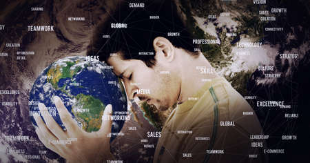 Composition of network of connections with text over man leaning his head on globe. global networking and connections concept digitally generated image.