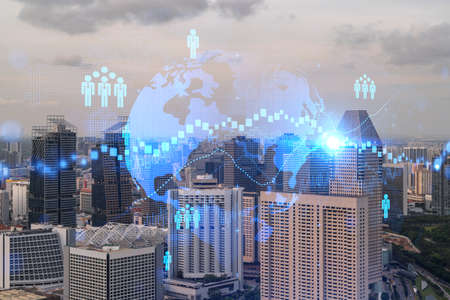 World planet Earth map hologram over panorama city view of Singapore, Asia. The concept of international connections and business. Multi Exposure.
