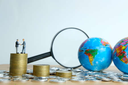 Miniature people business concept -two businessman make an agreement Global trade partnership above coin stack and globe
