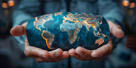 Hands holding a glowing earth globe in the dark, symbolizing care and protection.