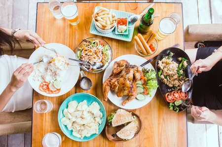 Top view of various comprehensive lunch European eating on wooden table. Variety of dishes made from fresh, natural products, salad and drinks. Cooking backgrounds concept. Copy ad text space, poster