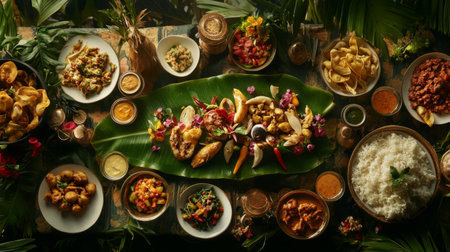 A stunning overhead view of a vibrant feast showcasing a variety of traditional dishes beautifully arranged on a large banana leaf surrounded by tropical leaves and flowers.