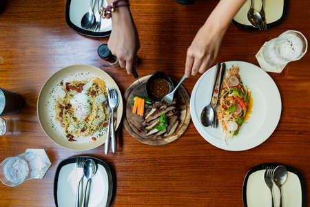 Top view Food with Fried rice with eggs, vegetables, papaya salad Fried Chicken and Fried Kale, Thai pork sausage salad On a white wooden table
