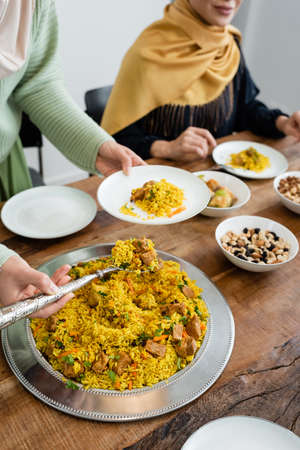 Cropped view of young muslim woman serving pilaf near blurred mom and food at home