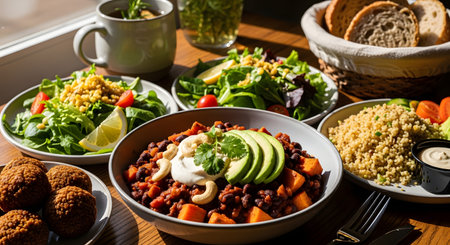 A delicious and healthy spread of plant-based vegan food served on a wooden table in a sunlit cafe. The meal includes a hearty black bean and sweet potato chili topped with avocado, fresh salads, falafel, couscous, and whole-grain bread.