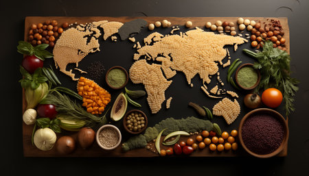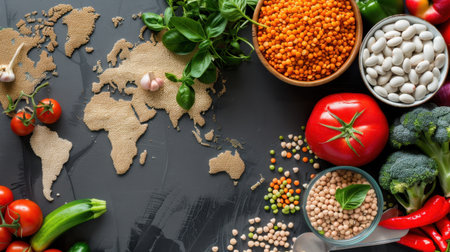 A vibrant arrangement of fresh vegetables and ingredients against a artistic map design, showcasing the essence of global cuisine and healthy eating.