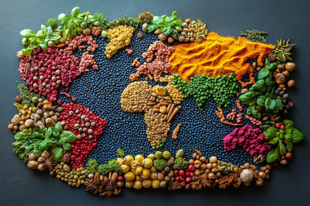 A captivating representation of the world created using an array of spices and herbs highlighting the variety found in global cuisine.