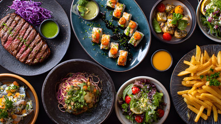 Assorted gourmet dishes including steak, sushi rolls, salad, fries, and colorful sauces on a dark table setting.