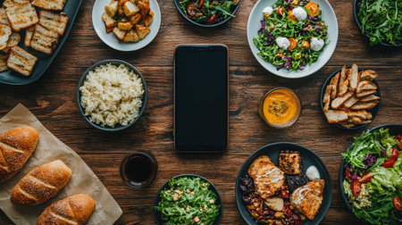 A beautifully arranged spread of diverse and delicious meals on a wooden table, featuring a smartphone central to modern dining experiences.