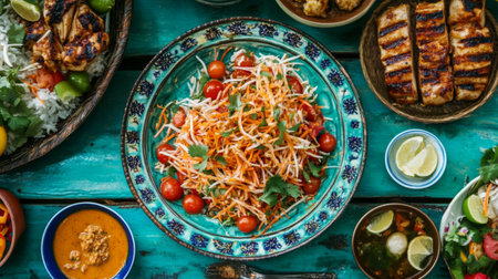 A vibrant Thai feast featuring a colorful plate of Som Tum salad with shredded green papaya, cherry tomatoes, and grilled chicken, highlighting the perfect balance of flavors