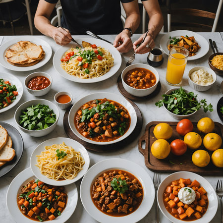 An inviting dining setup showcasing a variety of dishes on a wooden table. Vibrant colors and generous portions create a warm, communal dining experience.