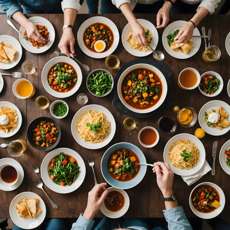 A lavish table with various colorful bowls and plates, filled with soups, pastas, and fresh vegetables. People share a meal in a welcoming and relaxed atmosphere.