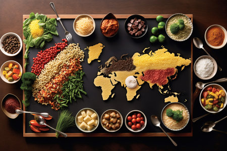 A stunning representation of global cuisine, this image features a creative map filled with various dishes, highlighting the rich diversity of cultural flavors and culinary traditions around the world.