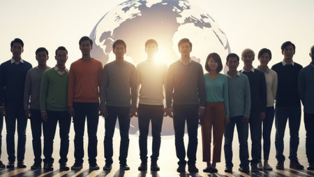 Green showing diverse group of people standing in a circle around a glowing earth globe on a grassy field at sunset...