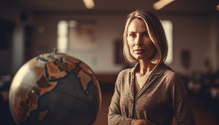 Presenting woman holding printed documents and displaying data at conference room, with world map. Business meeting, collaboration, professional, modern, strategy, analytics, teamwork