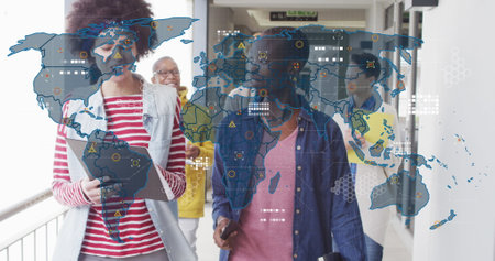 Image of world map and data network over diverse colleagues discussing at casual office. Business, connection, teamwork, digital interface and global communication, digitally generated image.