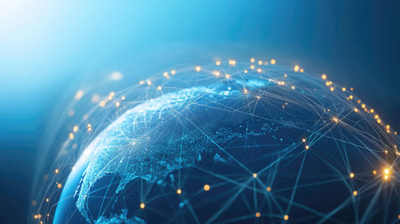 This image showcases a stunning view of Earth with a network of digital lines and glowing lights, symbolizing global connectivity and communication.