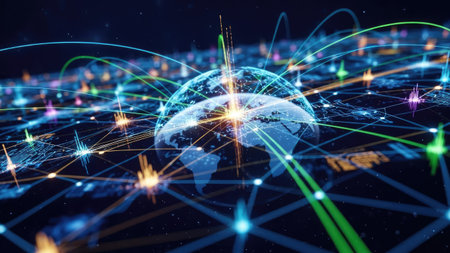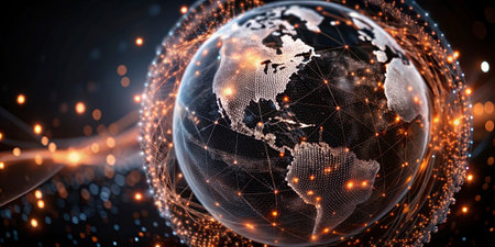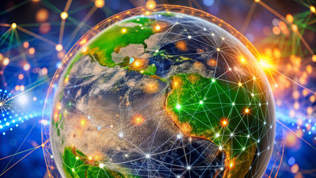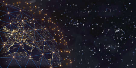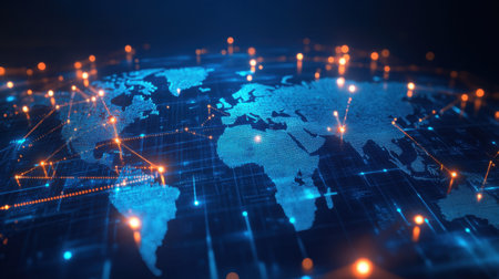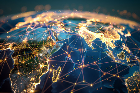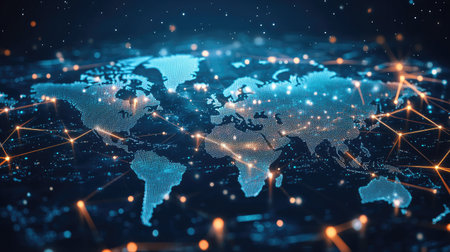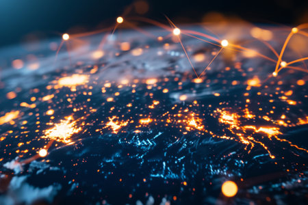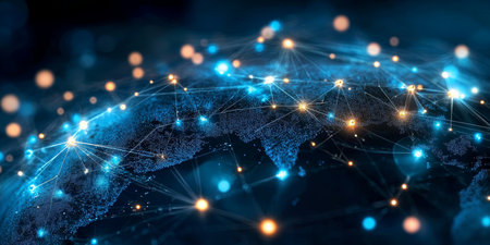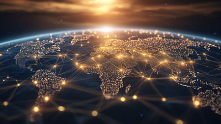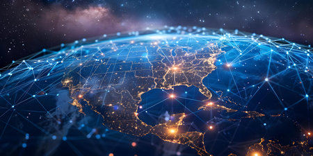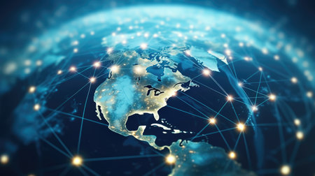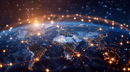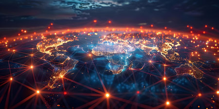 Digital illustration of global network connectivity with glowing nodes and links over Earth at night