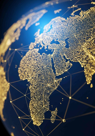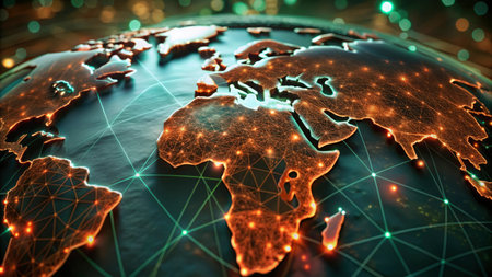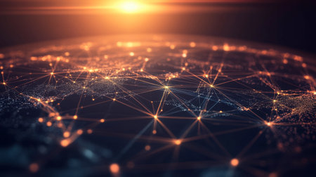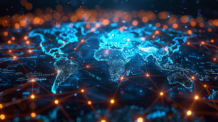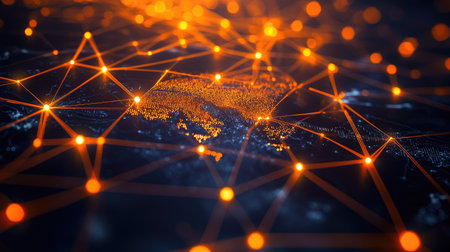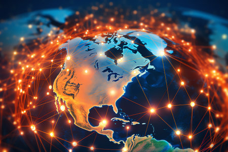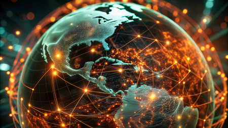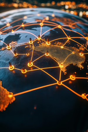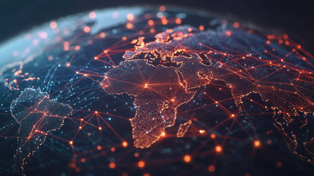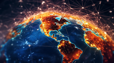 Abstract view of a global network with illuminated connections linking continents in warm tones