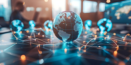 A 3D rendering of a global network, with interconnected nodes and digital communication lines.