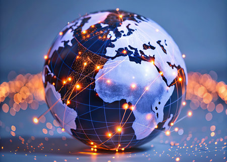 A globe showcases various countries linked by illuminated networks, symbolizing global connections and communication. The intricate pathways emphasize international relations and trade.