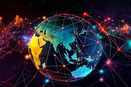 A blue and yellow globe with a network of lines connecting the continents. The globe is lit up with a variety of colors, giving it a vibrant and dynamic appearance