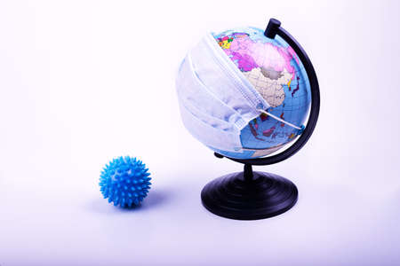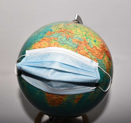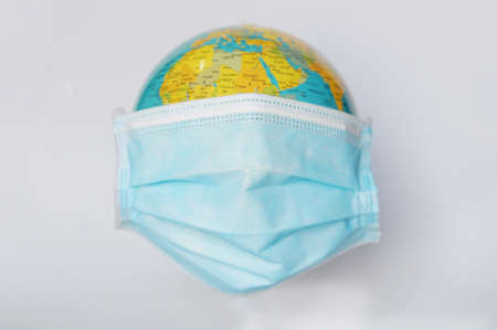 Disposable medical mask on the globe, model of the Earth. The concept of a pandemic. COVID-19, coronavirus. World epidemic of the disease. COVID Dangerous virus.