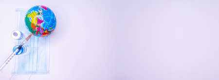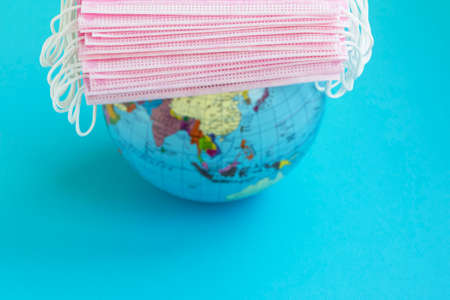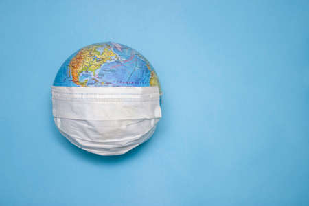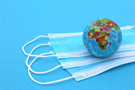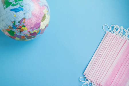 Medical masks and globe on a blue background with space.
