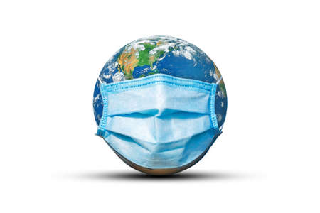 Earth globe with medical mask isolated on a white background. Ecological concept. Coronavirus concept. Coronavirus outbreak and epidemic in the world.