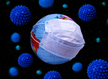 The concept of the globe is covered with a protective mask against coronavirus covid 19 infection.