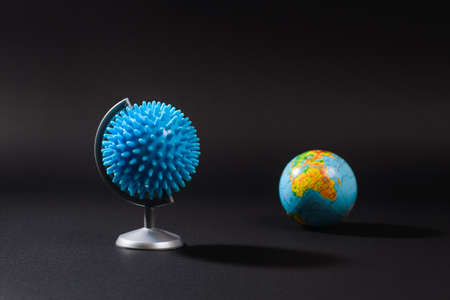 Globe in the form of coronavirus on a black background. In the background is a globe. The concept of a worldwide coronavirus pandemic sweeping the world.