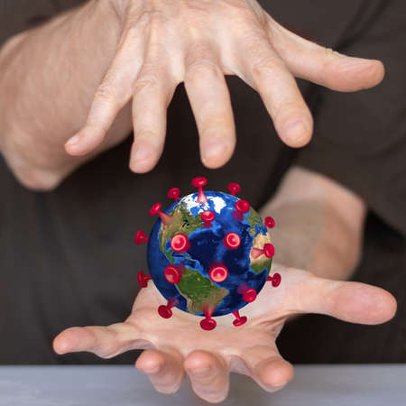 3d image of a stylized covid virus disguised as a globe. The virus is in the space between the hands