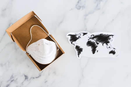 concept of international trade during the covid-19 pandemic outbreak, delivery parcel with virus protection face mask next to world map