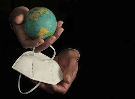 Hand holding a globe and a medical mask on a black background.