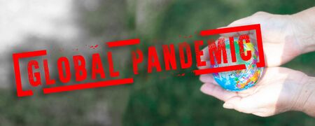Human hands holding a global with red global pandemic stamp on a dark green background.