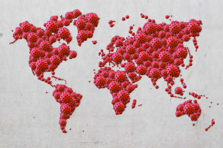 A pandemic of covid corona virus plague that crosses international boundaries, affecting people on a worldwide scale, map of the world made of virus model on grey concrete background