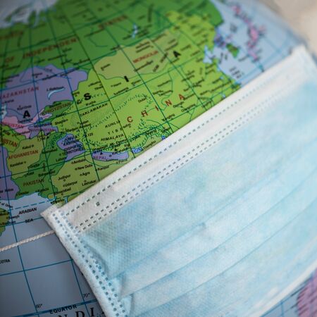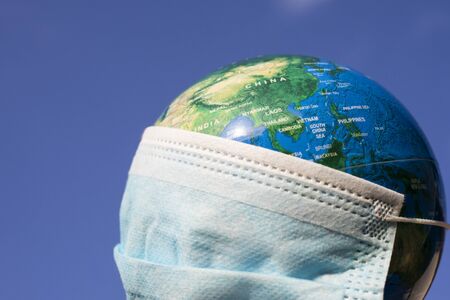 Coronavirus pandemia danger. Coronavirus Medical mask and globe. Surgical protective mask