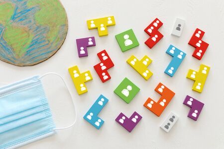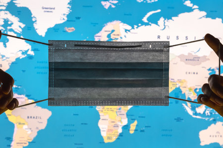 Surgical mask with a map of the world on yellow background. Concept of global spread of Covid-19. Coronavirus outbreak virus quarantine background, concept of quarantine at home as preventative measure against coronavirus outbreak..