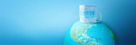 globe of planet dressed a medical mask with text Covid -19 worldwide epidemic. Coronavirus and quarantine planet infection pandemic concept