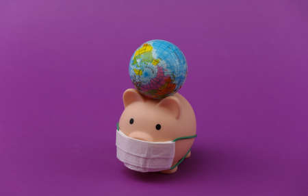 Piggy bank in medical mask with globe on purple background. Covid-19 pandemic